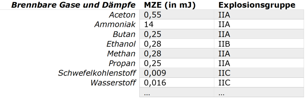 Setzt man das ins Verhältnis zur Mindestzündenergie (MZE) explosionsfähiger Gase und Dämpfe zeigt sich deutlich, wie hoch die Explosionsgefahr ist: