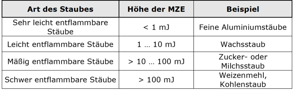 Eine allgemeine Aussage trifft die Einteilung der Berufsgenossenschaft Rohstoffe und chemische Industrie, die die Stäube gemäß ihrer Mindestzündenergien in insgesamt 4 unterschiedliche Klassen einteilt: