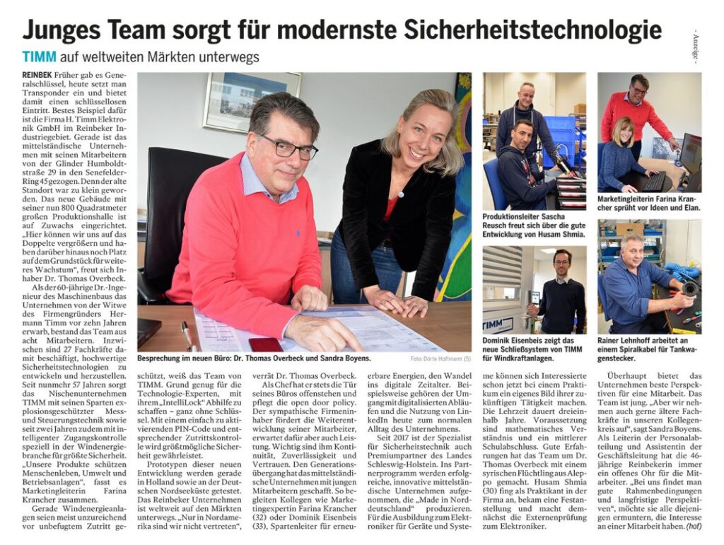 Nach dem erfolgreichen Umzug in unser schönes neues Firmengebäude im Senefelder-Ring in Reinbek, nutzen wir die Gelegenheit und stellen TIMM heute der Nachbarschaft im Bille Wochenblatt vor: