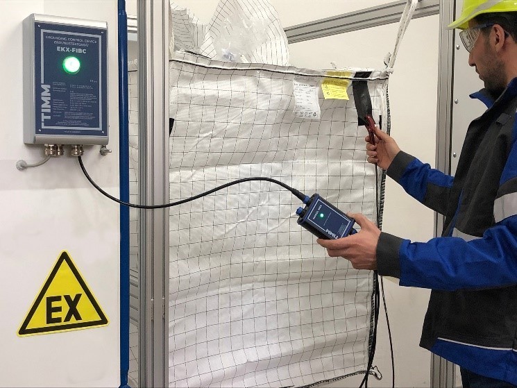 It is therefore appropriate nowadays to use monitored grounding devices such as the TIMM EKX-FIBC for grounding big bags type C. Such devices continuously monitor the correct grounding of the big bag and its quality and can be interlocked into the loading control system via their relay and NAMUR control outputs. For example, warning and release signals can be sent to the loading control.